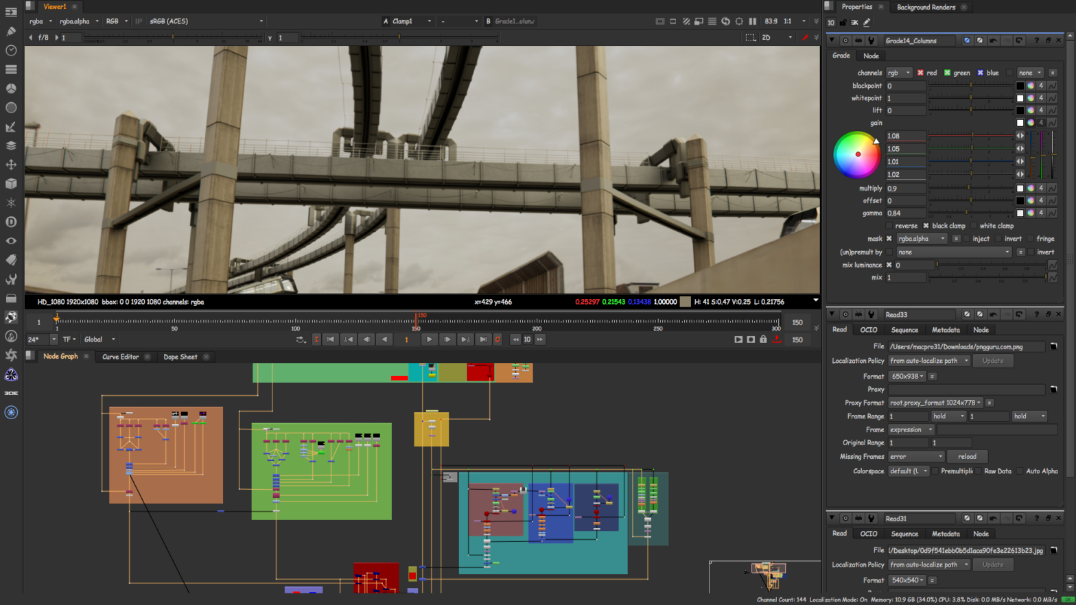 These node graphs depict the setup for both train and the track rebuild. To avoid having to use holdout mattes, I rendered my passes in deepEXR from Arnold, which made the difficult compositing a bit simpler and helped me to add more specific effects into my composition.